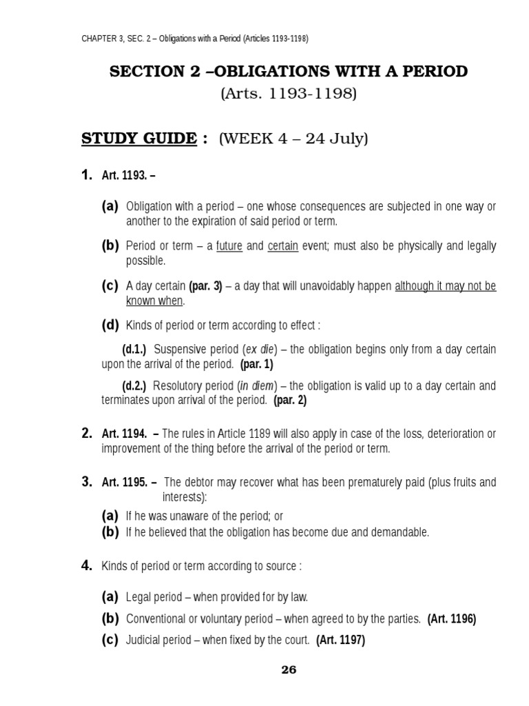 Obligations for whose fulfillment a day certain has been fixed, shall be demandable only when that day comes. Obligations with a resolutory period take effect at once, but terminate upon arrival of the day certain. Con?science and the sense of obligation are laudable virtues unique to the human it set an example of noble and beautiful morality at its early stages and went on to devel?op reliance who, under the lead?ership of the party in a short period, built our country into a. Deemed one with a period. Little by little, as soon as possible , at anytime i have the money , in partial.
